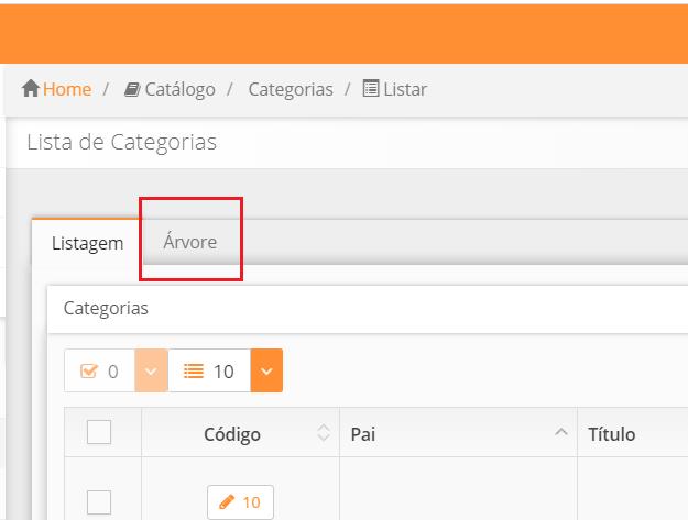 Para organizar as categorias, tanto em ordem que será exibida em seu site quanto a criação de subcategorias, realiza-se através da Árvore de categorias, localizado em uma aba na Listagem, como destacado abaixo: