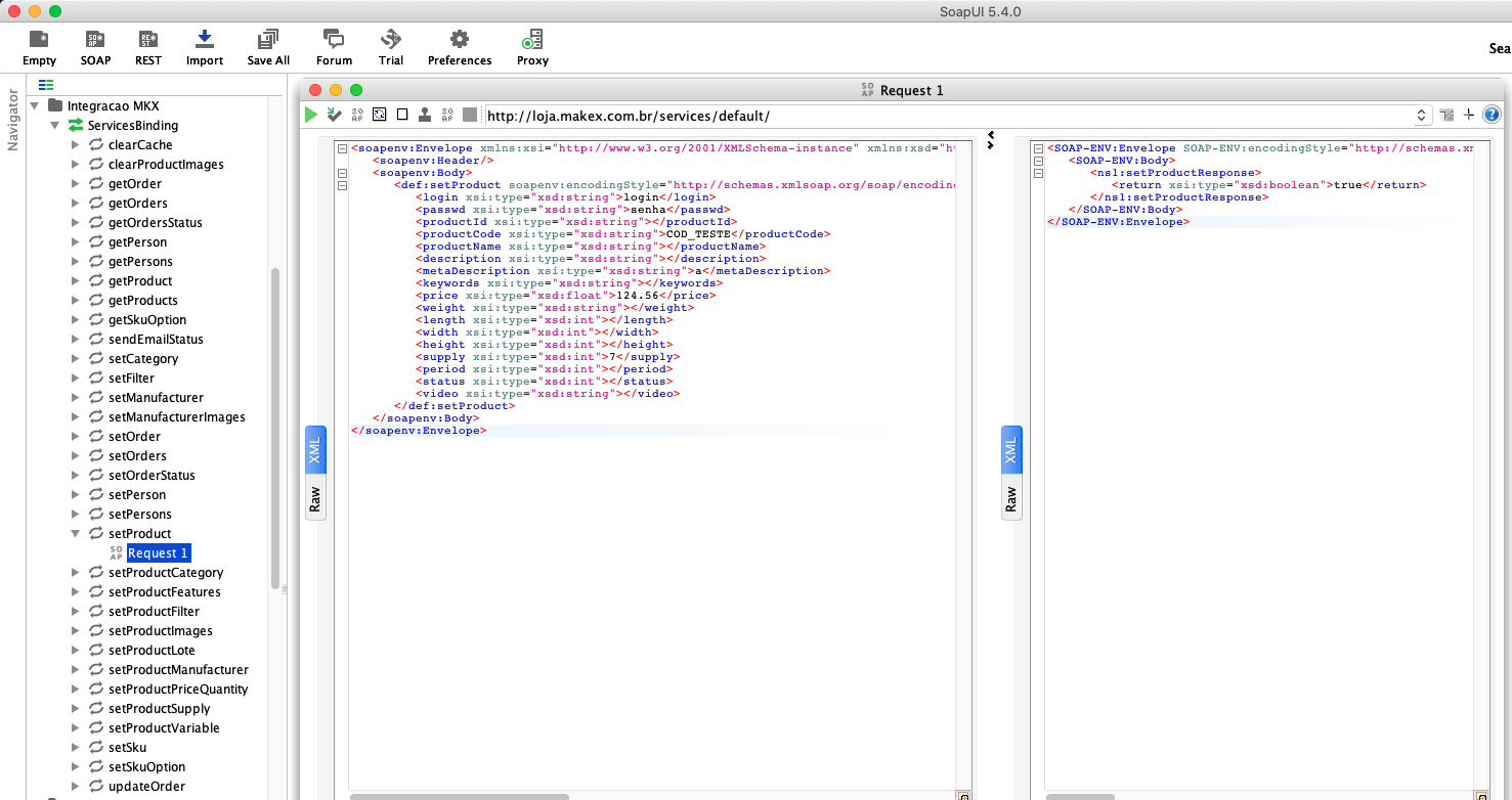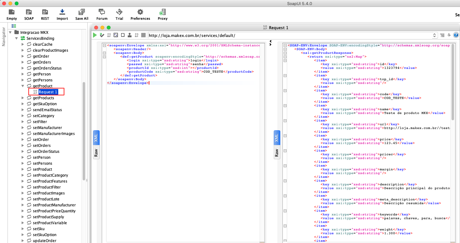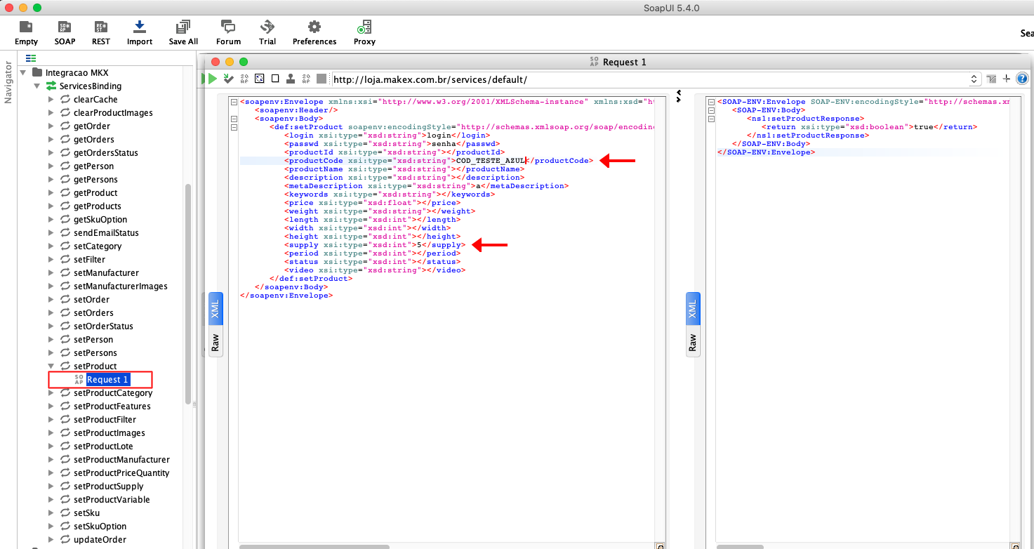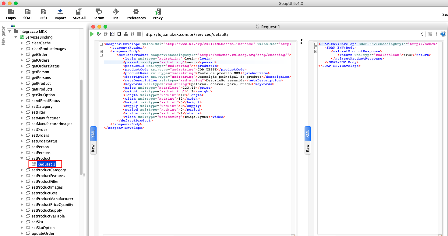O mesmo método utilizado para criar o produto é utilizado para alterar, o setProduct. A diferença é que se o productCode ou productId informado exista na MKX, o produto é atualizado e não mais cadastrado. Na figura abaixo, foram alterados apenas o preço e o estoque do produto, os parâmetros que não foram preenchidos, não são alterados na MKX. Para alterar um produto, também podemos utilizar o parâmetro: productId