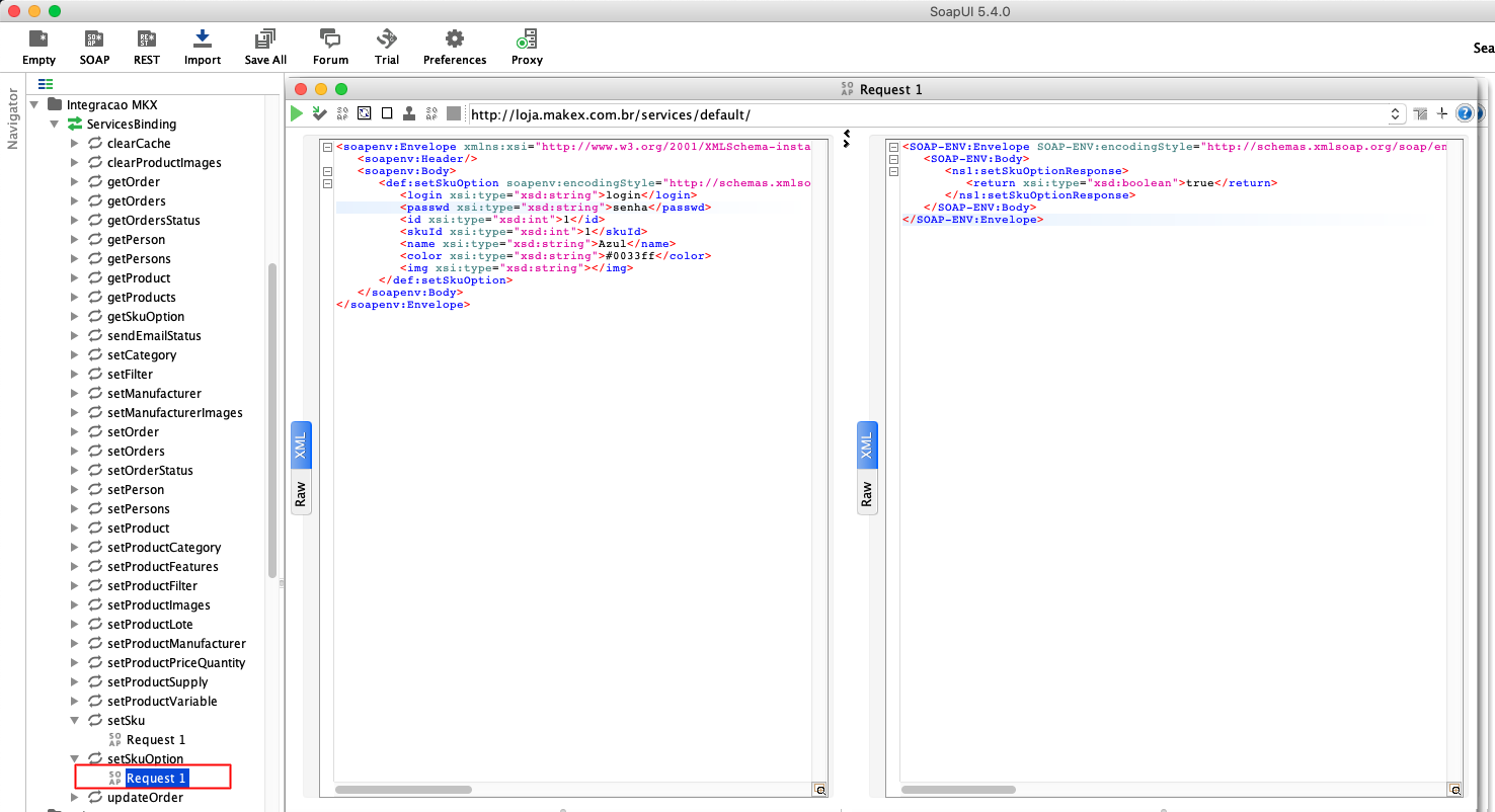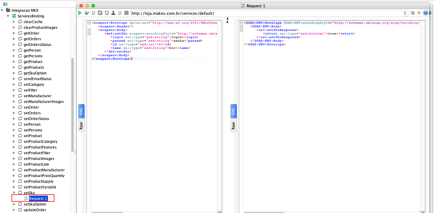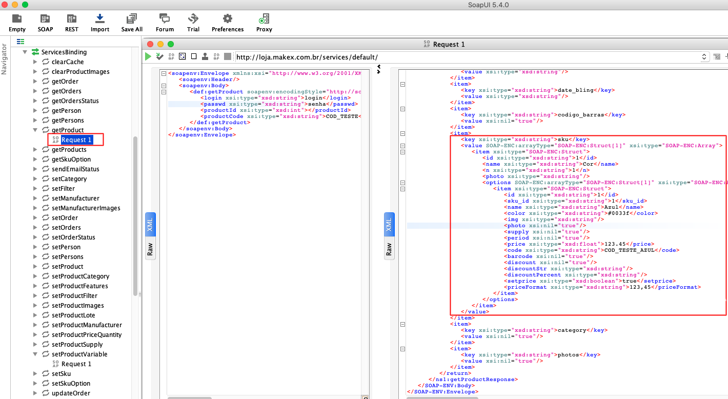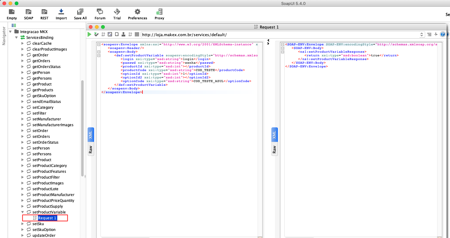 O mesmo método utilizado para criar o produto é utilizado para alterar, o setProduct. A diferença é que se o productCode ou productId informado exista na MKX, o produto é atualizado e não mais cadastrado. Na figura abaixo, foram alterados apenas o preço e o estoque do produto, os parâmetros que não foram preenchidos, não são alterados na MKX. Para alterar um produto, também podemos utilizar o parâmetro: productId