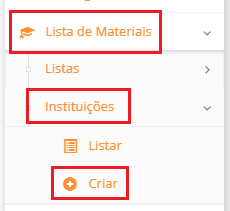 Para isso, acesse no seu ADMIN o menu “Lista de Materiais > Instituições > Criar”